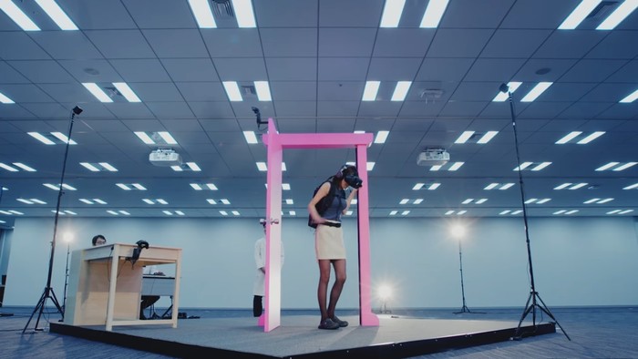 Pengguna bisa menggerak-gerakan tangan di dalam virtual reality. Hal ini berkat sensor yang dipasang mengelilingi area. Foto: screenshot YouTube