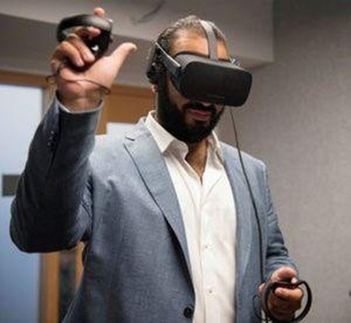 Di kantor Facebook, Pangeran Mohammed terlihat asyik mencoba headset virtual reality Oculus Rift. (Foto: Dok. Internet)