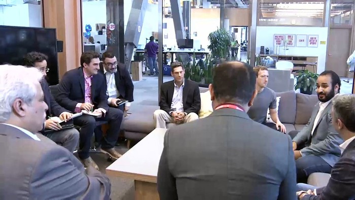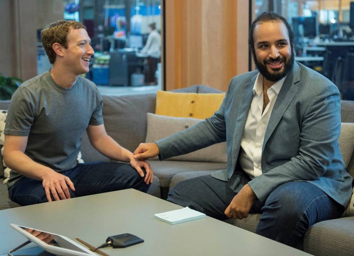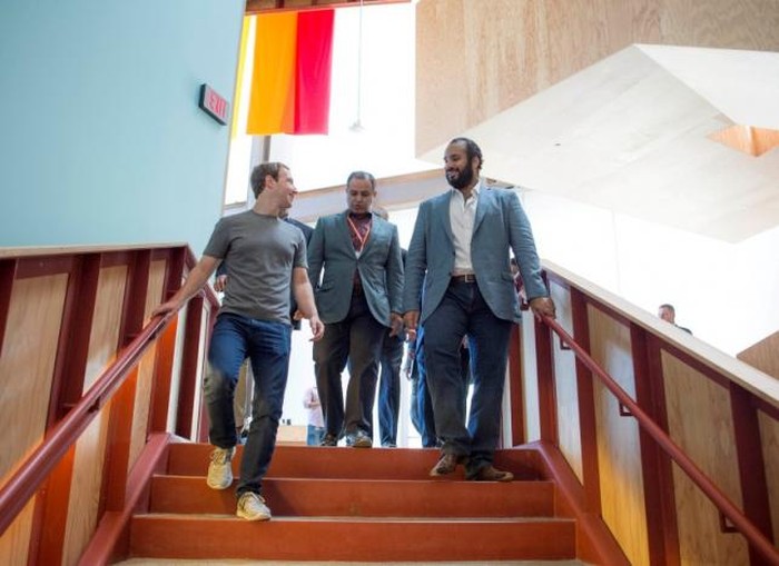 Kedatangan Pangeran Mohammed tanpa baju kenegaraannya disambut langsung oleh Zuckerberg. Sang tuan rumah pun mengajaknya berkeliling Facebook. (Foto: Dok. Internet)