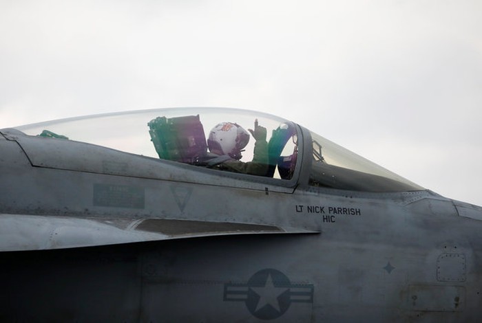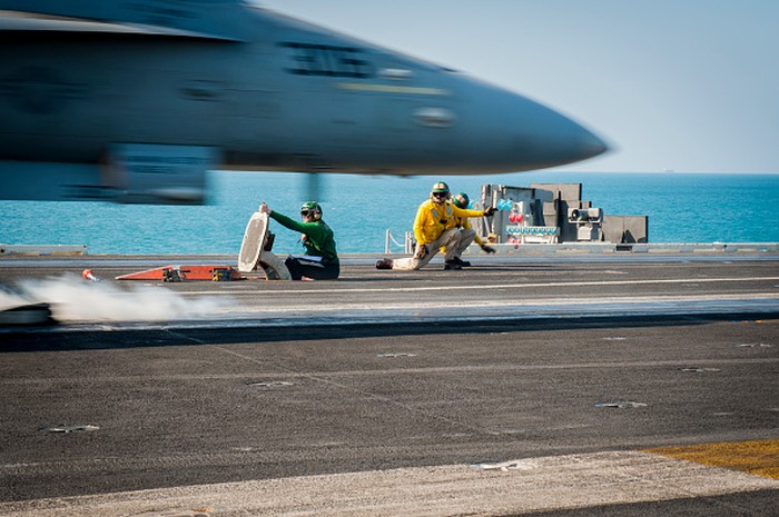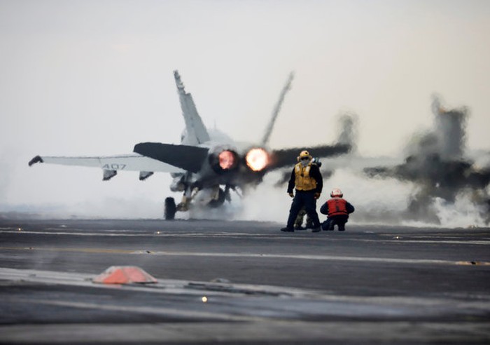 Kru kapal sedang mengarahkan pesawat tempur di atas dek Carl Vinson. Foto: Reuters