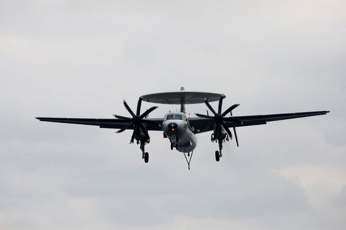 Pesawat mata-mata E-2C Hawkeye mendekati geladak kapal. Foto: Reuters