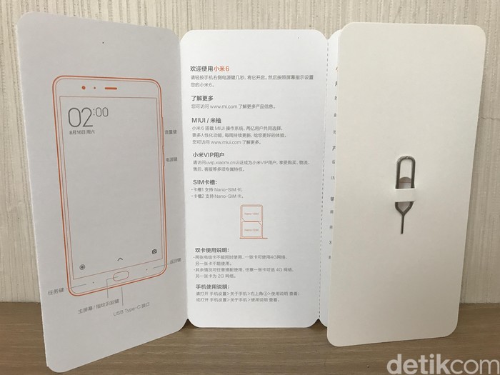 Beginilah tampilan kardus Mi 6 ketika dibongkar. Di dalamnya terdapatΒ Jelly case warna hitam transparan, buku panduan singkat pemakaian, konverter dari USB type C ke konektor audio 3,5 milimeter, dan lainnya.Β Foto: detikINET/Herry SW