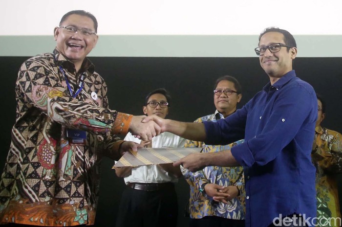 Direktur PT Bank Tabungan Negara (Persero) Tbk Handayani dan CEO Go-Jek Indonesia Nadiem Makarim menandatangani kerjasama disaksikan Menteri Komunikasi dan Informatika Rudiantara, Ketua Dewan Komisioner Otoritas Jasa Keuangan (OJK) Muliaman D Hadad dan Deputi Ekonomi Kreatif Kemenko Bidang Perekonomian Rudy Salahudin di Jakarta, Selasa (09/05/2017).