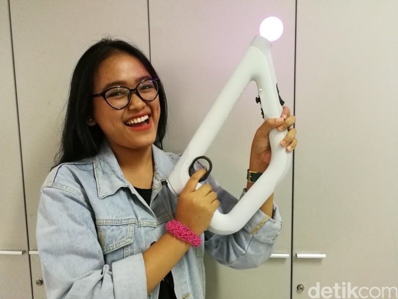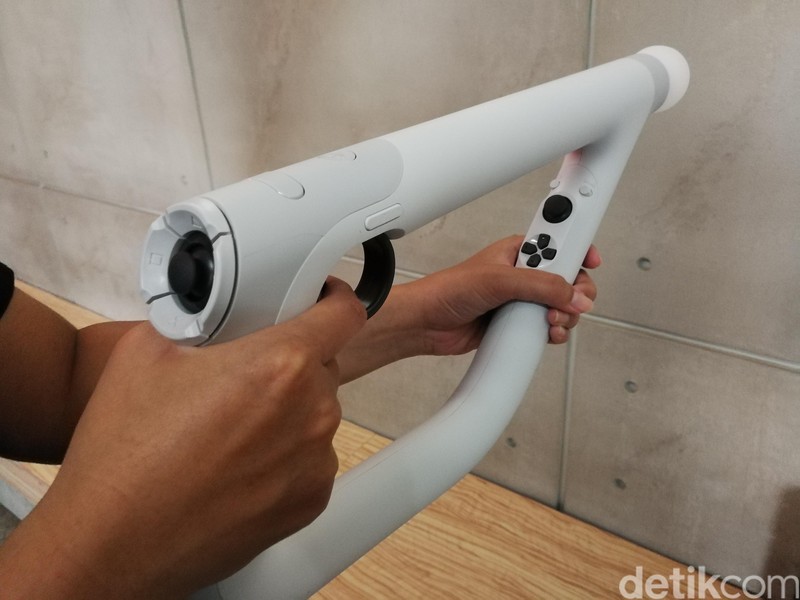 Meski begitu, kontroler ini cukup nyaman untuk digenggam. Dan menyiratkan kesan menggenggam senjata sesungguhnya. Foto: Muhammad Alif Goenawan/detikINET