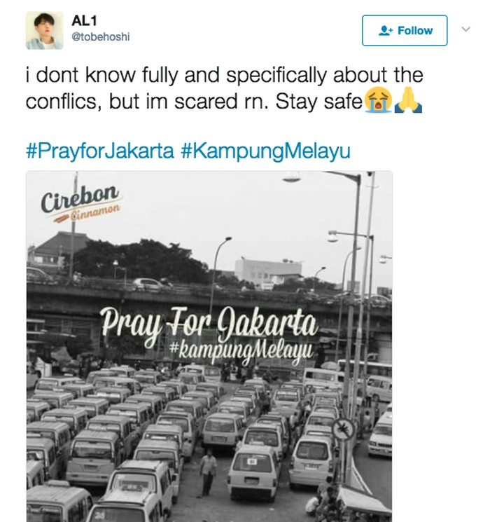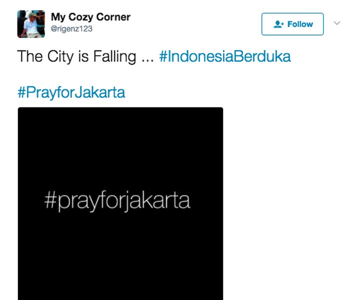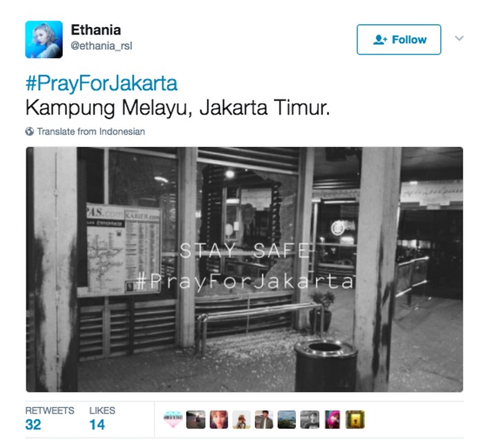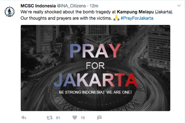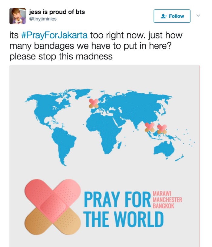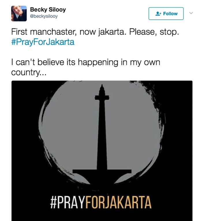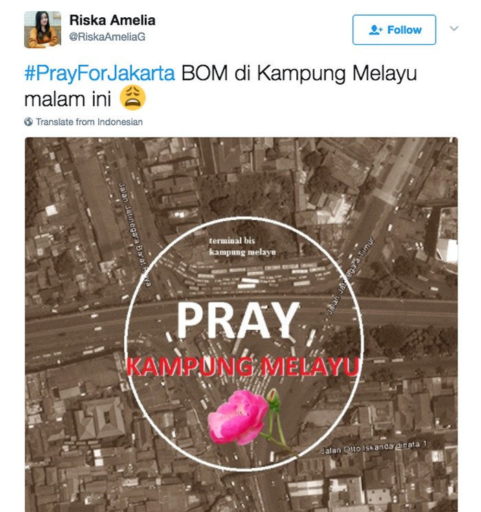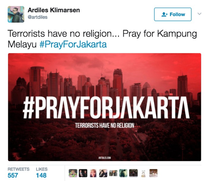 FotoINET #PrayForJakarta Menggema di Linimasa Pool - detikInet Rabu, 24 Mei 2017 23:31 WIB Tautan telah disalin Jakarta - Linimasa media sosial seperti Twitter dibanjiri tulisan maupun foto bertema #PrayForJakarta atau doakan Jakarta. Ilustrasi bertema Pray For Jakarta membanjiri media sosial. Foto: istimewa Netizen mengutuk pelaku dan bersimpati pada korban. Foto: istimewa Serta berharap agar semua warga Jakarta tetap baik-baik saja. Foto: istimewa Gambar Monas pun jadi latar belakang. Foto: istimewa Kalau ini lokasi beberapa ledakan bom terbaru termasuk yang baru saja terjadi di Kampung Melayu. Foto: istimewa Foto: istimewa Foto: istimewa Foto: istimewa (/) TAGS bom kampung melayu LIHAT LAINNYA Tautan telah disalin