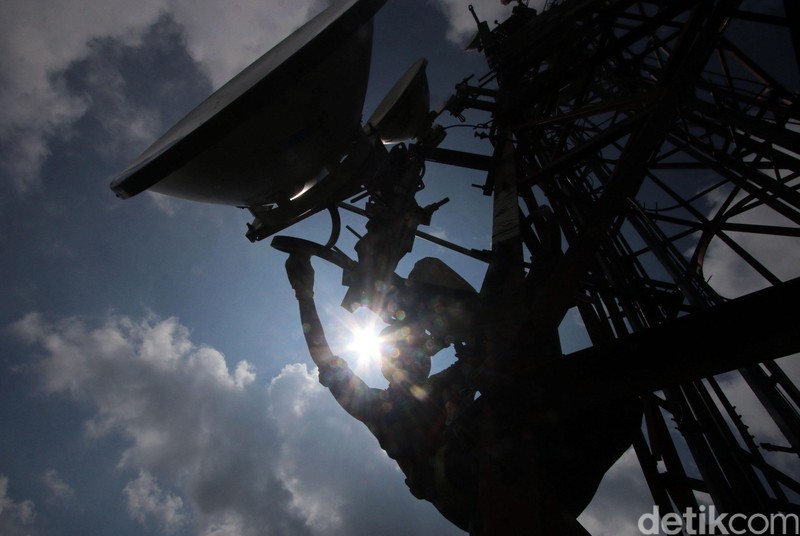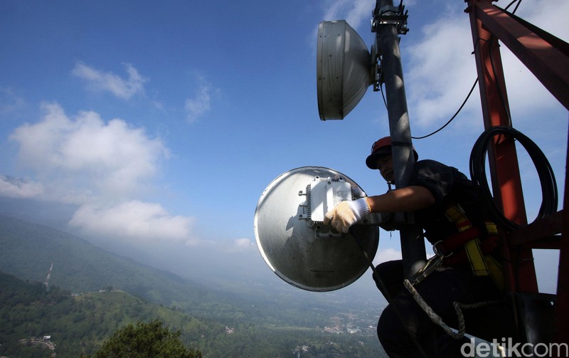Petugas teknisi XL memeriksa perangkat jaringan BTS 4G di kawasan Puncak.