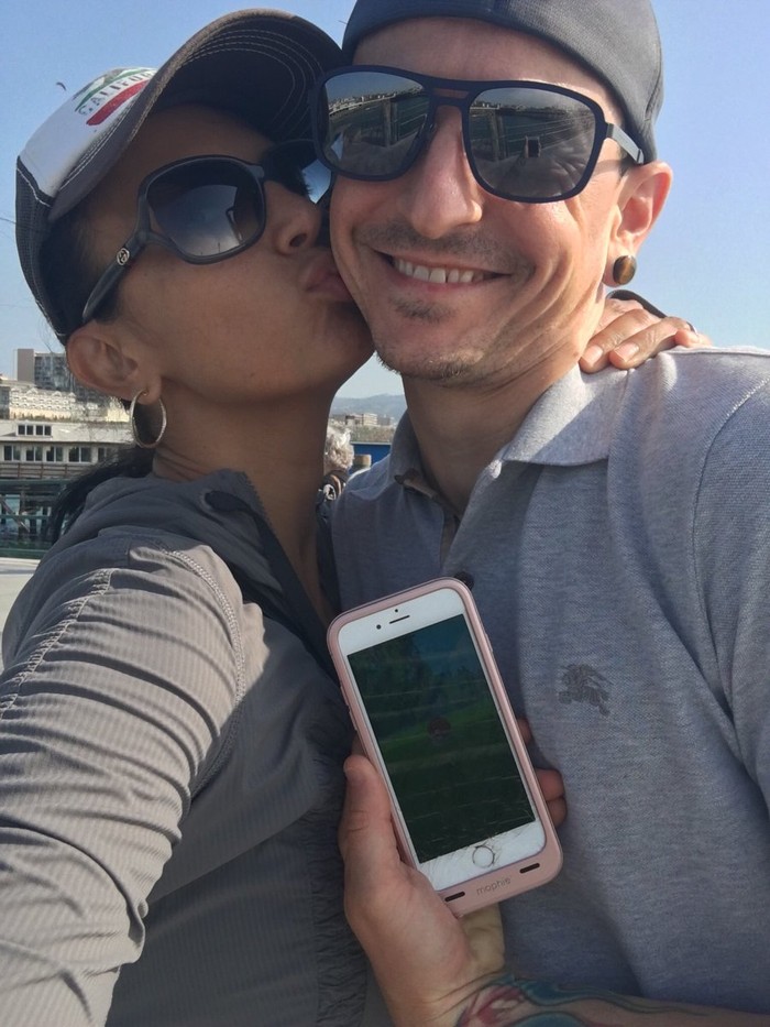 Bersama sang istri, Chester ikutan berburu Pokemon Go. Foto: Chester Bennington