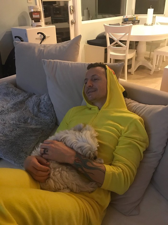 Chester yang tengah mengenakan kostum Pikachu tengah memeluk anjing kesayangannya. Foto: Chester Bennington