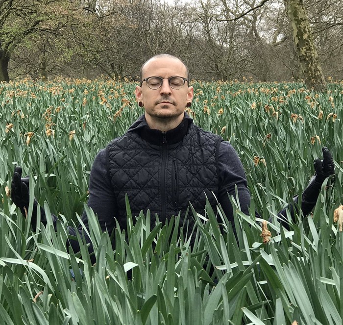 Sang vokalis Linkin Park ini sedang yoga di hamparan tumbuhan. Foto: Chester Bennington