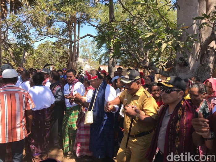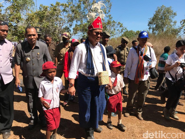 Saat tiba di Desa Tode, Menkominfo dipakaikan baju adat setempat. Foto: Adi Fida Rachman/detikINET