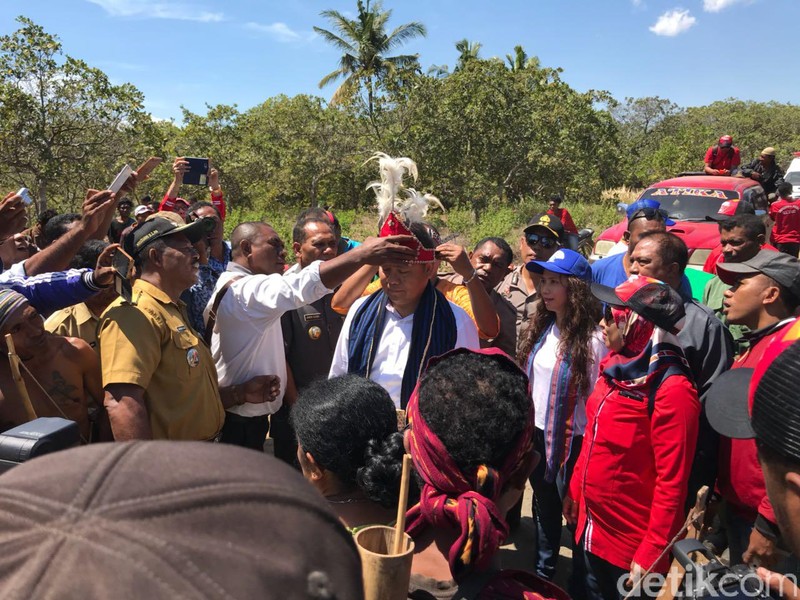 Saat tiba di Desa Tode, Menkominfo dipakaikan baju adat setempat. Foto: Adi Fida Rachman/detikINET