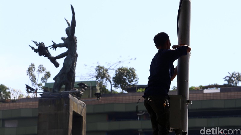 Petugas menambah antena dan penguat sinyal di sekitar kawasan bunderan HI guna memberikan koneksi internet yang maksimal.