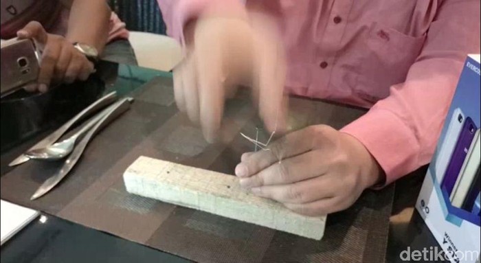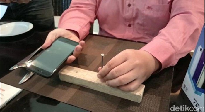 Evercoss pun coba membuktikan kekuatan layar Kingkong ini. Sebuah paku beton pun dipersiapkan di atas meja. Foto: Yudhianto/detikINET