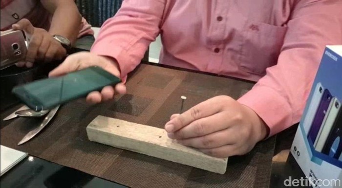 Paku beton yang ada di meja ini pun digetok dengan layar Kingkong ponsel ini. di Foto: Yudhianto/detikINET