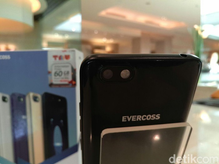 Evercoss menyematkan kemampuan 8 MP di bodi belakang dan depan. Produsen lokal ini juga membekalinya dengan filter stiker ala Snapchat atau Instagram yang menawarkan karakter-karakter lucu. (Foto: detikINET/Yudhianto)