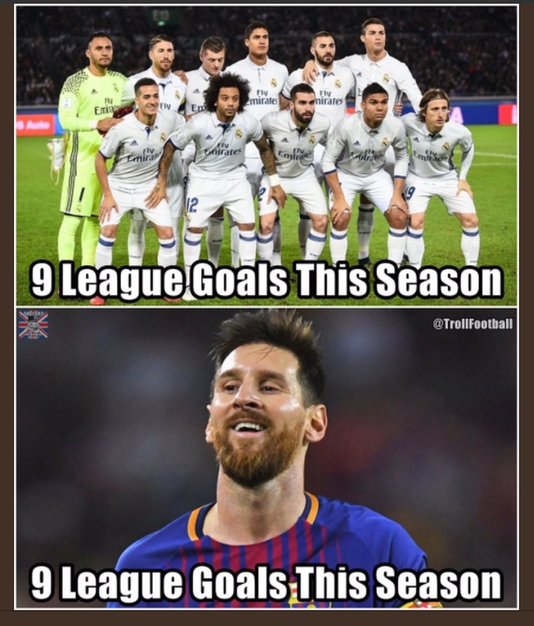 Real Madrid kena sindiran karena produktivitas gol seluruh tim disamai seorang Lionel Messi. Foto: istimewa