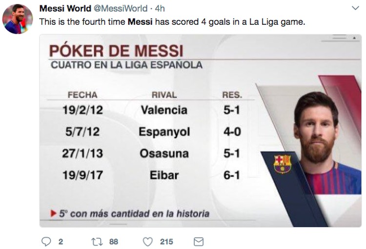 Sudah keempat kainya Messi mencetak 4 gol dalam satu pertandingan dalam kiprahnya di Liga Spanyol. Foto: istimewa