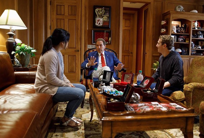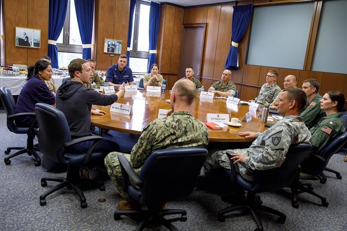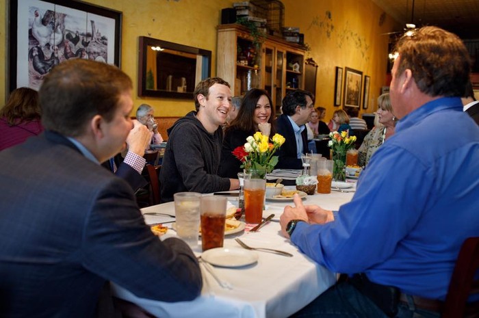 Zuckerberg saat ini sedang keliling Amerika Serikat dan bertemu banyak orang. Ia tetap kaosan atau memakai jaket meski lawan bicaranya super rapi seperti ini. Foto: Istimewa