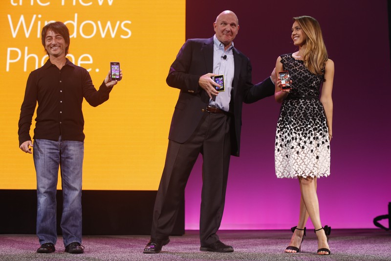Mantan CEO Microsoft Steve Ballmer memamerkan smarpthone Nokia Lumia 920 saat peluncuran Windows Phone 8 di San Fransisco pada tahun 2012. Nokia memang pendukung terkuat Windows Phone dan mengadopsinya sejak tahun 2011. (Foto: GettyImages)