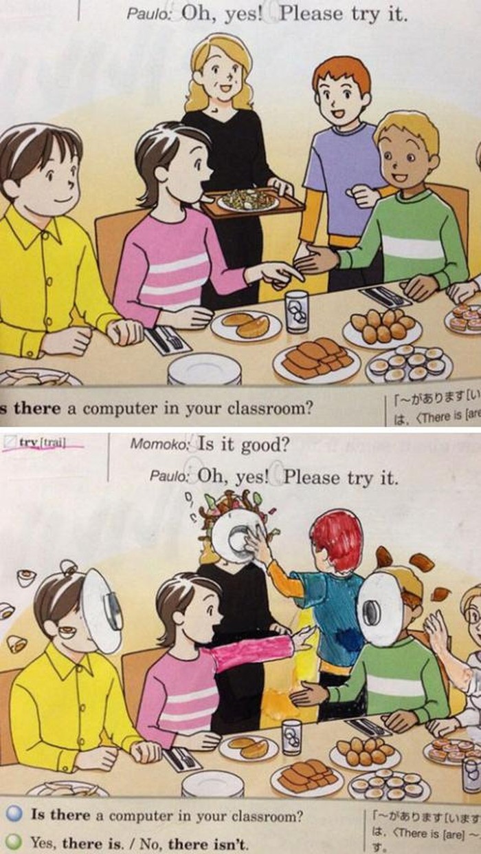 Mungkin berawal dari kebosanan, gambar di buku pelajaran ternyata bisa menjadi karya 'kreatif' hasil coretan anak sekolah. Ini contohnya yang viral.