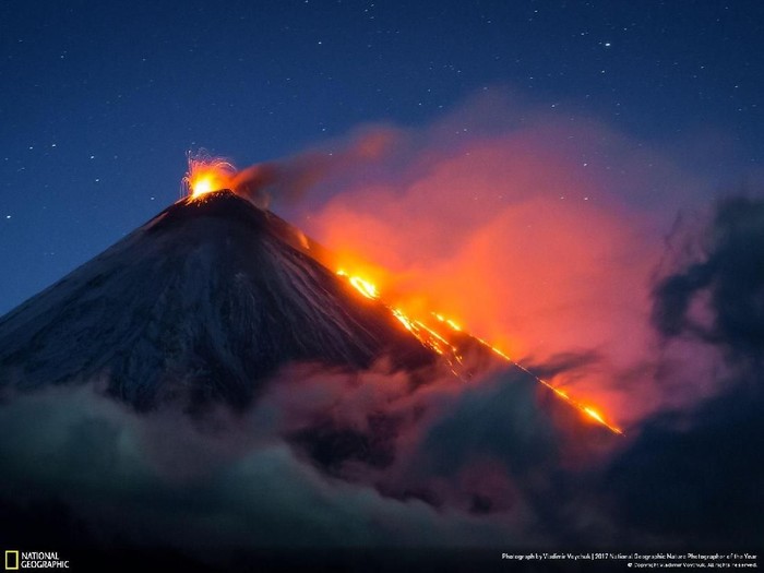 βVolkanoβ karya fotografer Vladimir Voychuk kategori Landscape. Penampakan letusan lava di gunung Klyuchevskaya Sopka, Rusia. Foto: National Geographic