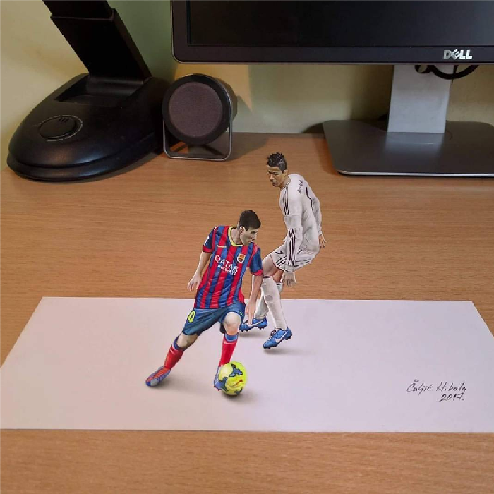 Pelukis gambar 3D antara Ronaldo vs Messi di atas adalah Nikola Culjic, seniman lukis asal Serbia. (Foto: Nikola Culjic)
