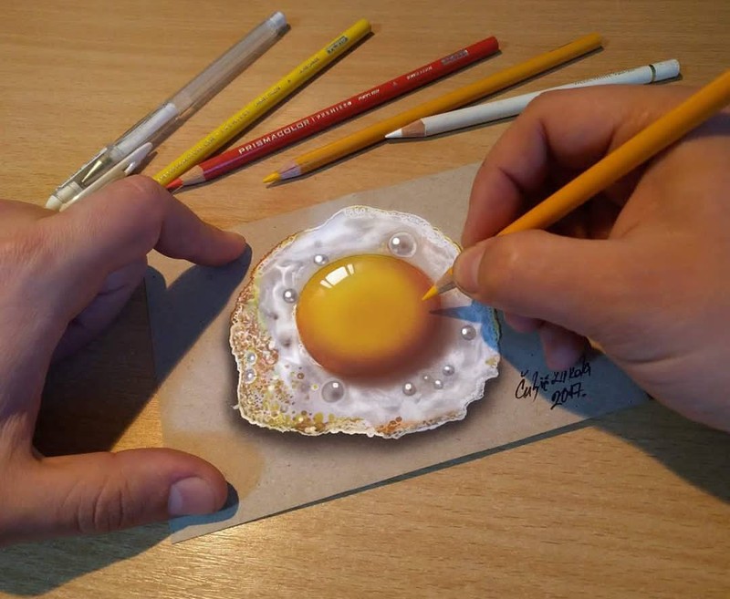 Dengan modal pensil warna dan kertas putih saja ia dapat membuat lukisan yang seolah keluar dari kertas. (Foto: Nikola Culjic)