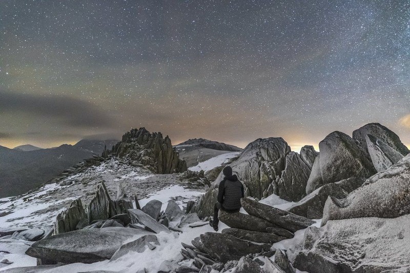 Seorang pengamat bintang duduk-duduk di salah satu puncak Castell-Y-Gwynt (Castle of the Winds) Gunung Glyder Fach di Snowdonia, Wales, di bawah langit malam dengan suhu yang membuat tubuh membeku. Foto: Kris Williams via PopSugar