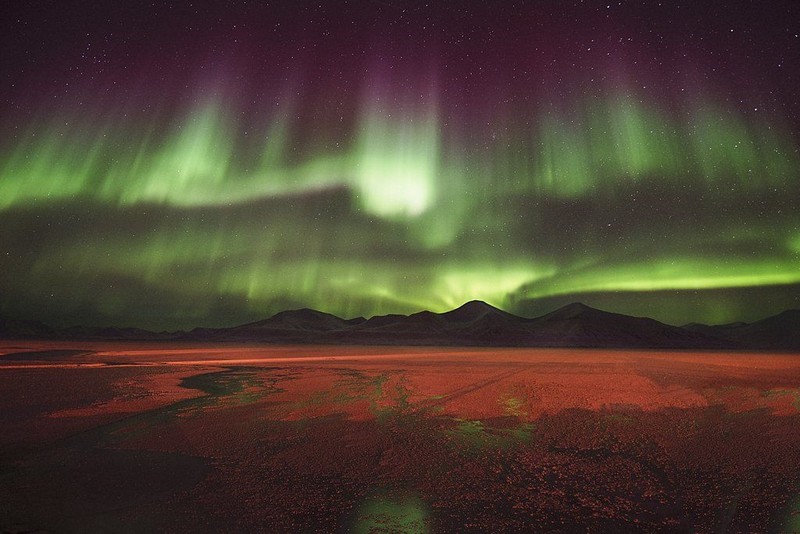 Perpaduan warna ungu dan hijau Aurora Borealis di atas langit kota penambangan batu bara di Svea, kepulauan Svalbard, Norwegia. Tampilan warna tanah di kaki langit yang berkilau merupakan pancaran lampu industri di dermaga Svea. Foto: Agurtxane Concellon via PopSugar