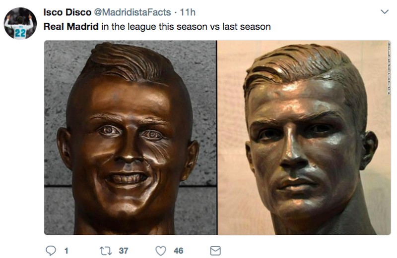Ronaldo pun tak kunjung mencetak gol. Digambarkan dalam meme ini sebelah kanan terlihat garang di musim lalu dan memble musim ini yang digambarkan di patung sebelah kiri. Foto: istimewa