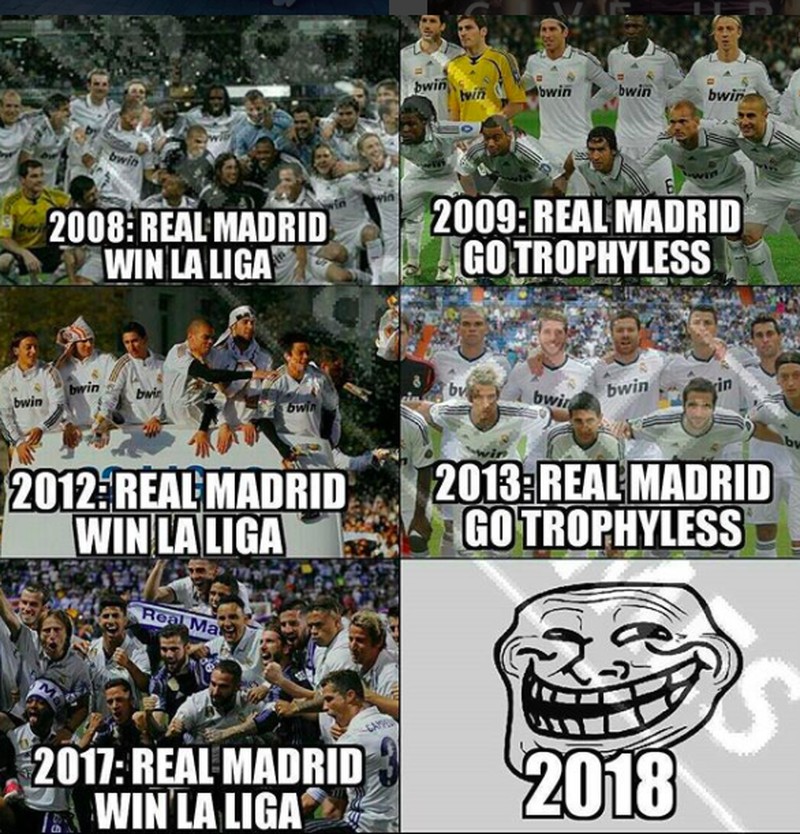 Jika mengikuti pola di atas, Real Madrid tidak memenangkan tropi usai juara liga. Bisa jadi musim ini demikian. Foto: istimewa