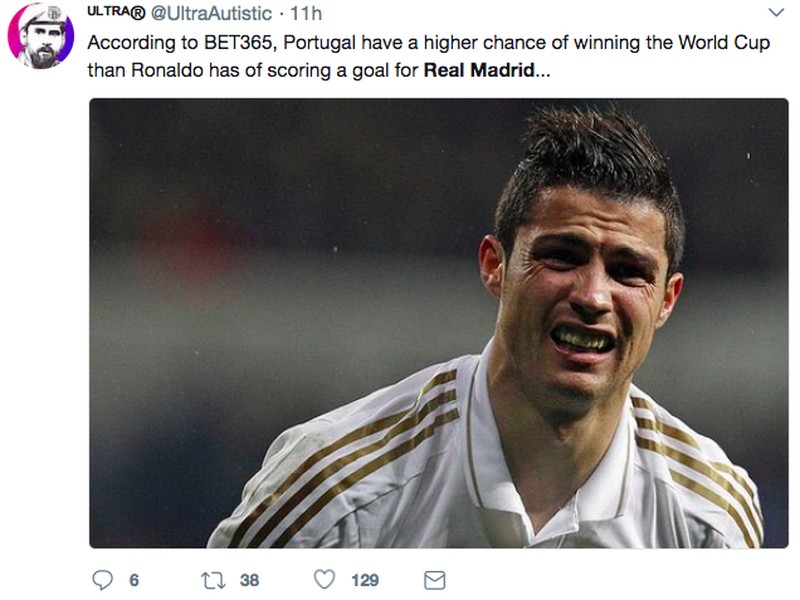 Meme ini jelas mengejek Ronaldo. "Menurut situs judi, peluang Portugal menjuarai Piala Dunia lebih tinggi ketimbang Ronaldo mencetak gol buat Real Madrid,". Foto: istimewa