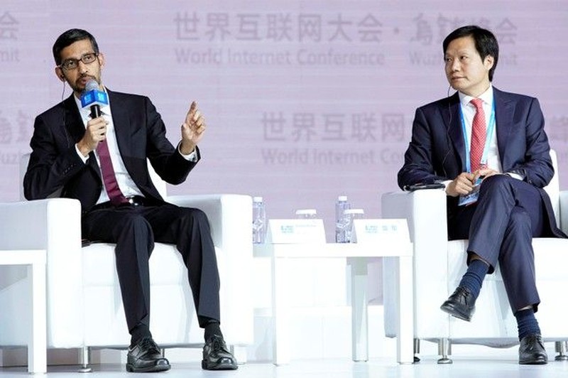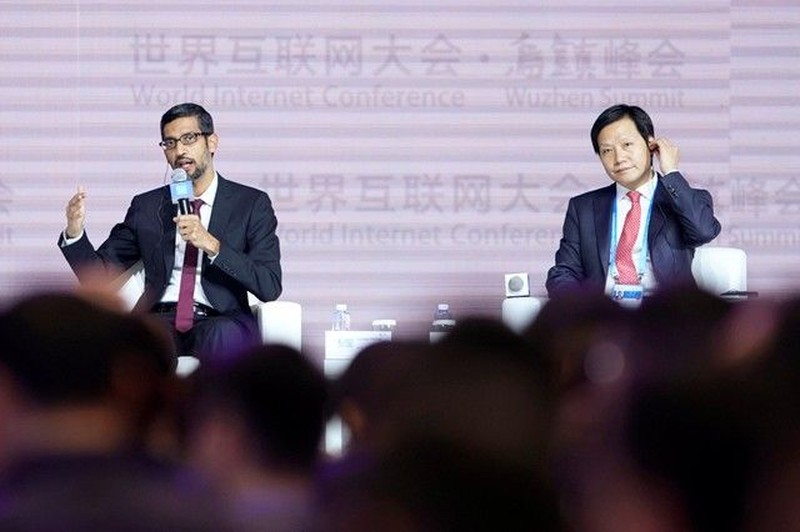 World Internet Conference di China yang bertujuan mempromosikan jaringan internet ala China ini diadakan setahun sekali. Tampak di panggung CEO Google Sundar Pichai dan CEO Xiaomi, Lei Jun. Foto: Reuters