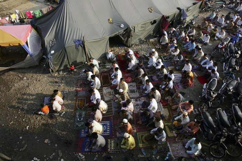 Idul Adha pertama korban tsunami Aceh pasca terjadinya bencana pada 21 Januari 2005. Mereka menggelar sajadah melaksanakan shalat Idul Adha di area pengungsian. (Foto:Spencer Platt/Getty Images)