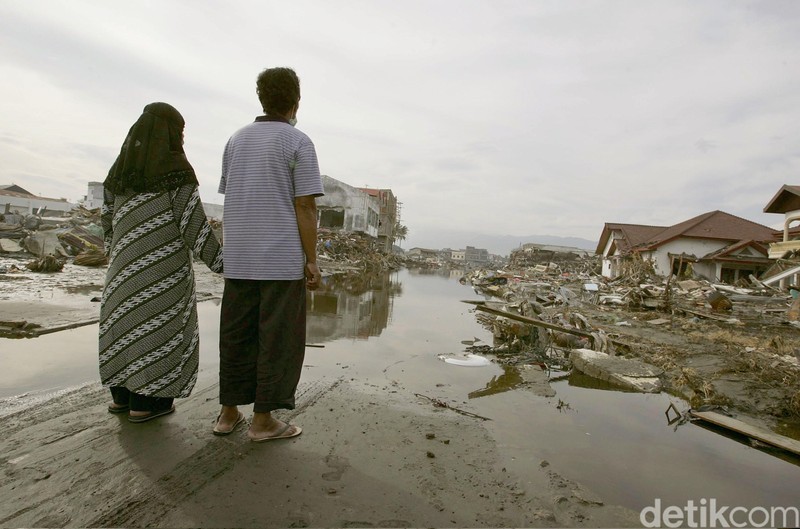 Korban selamat tsunami Aceh, Jasmi dan istrinya Sunarti bergandengan tangan menatap bekas rumah mereka yang tersapu tsunami pada 3 Januari 2005. (Foto:Dimas Ardian/Getty Images).