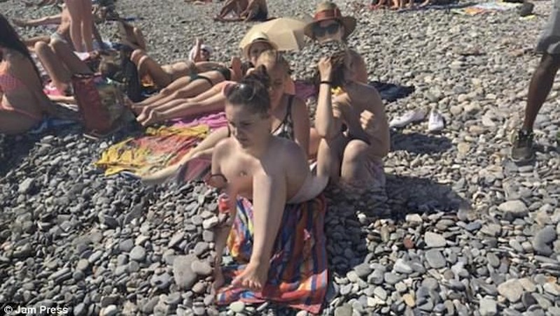 seorang wanita sedang bermain ponsel di tepi pantai, tapi kemana badannya? (Foto: Dailymail)
