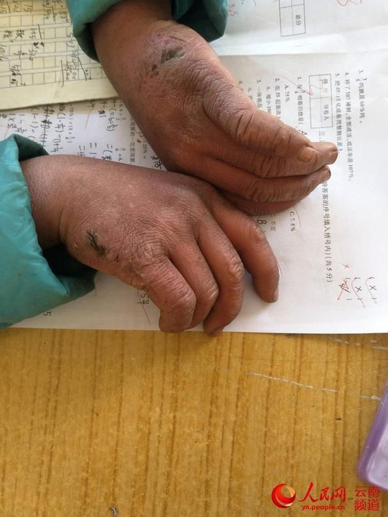 Tangannya di atas soal ujian di kelas. Bocah ini juga harus membantu neneknya di ladang sepulang sekolah sehingga kedua tangannya menjadi seperti itu. Foto: People's Daily