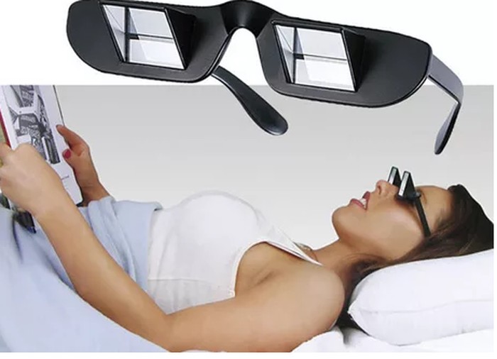 Tetap bisa membaca meski dalam posisi tidur lurus dan buku di bawah, karena kacamatanya ada cerminnya. (Foto: Brightside)