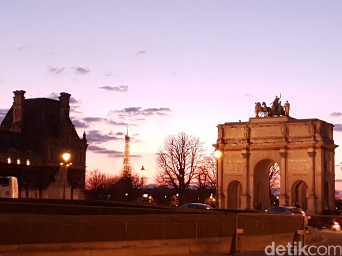 Pemandangan Menara Eifel dan Arc de Triomphe dari halaman Museum Louvre menggunakan mode manual, F1.5, ISO 250, 1/30s. (Foto: detikINET/Rachmatunnisa)