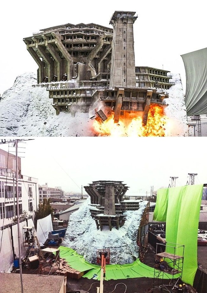 Reruntuhan gedung pada film Inception yang dilakukan di studio outdoor yang tetap dengan layar hijau. (Foto: Brightside)