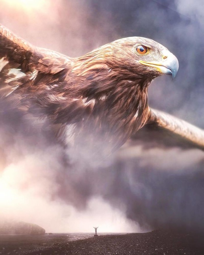 Burung besar dan manusia di bawahnya saling merentangkan sayap dan tangan. (Foto: Ebenism)