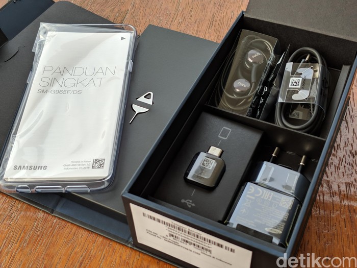 Aksesor yang diberikan Samsung dalam pembelian. Ada case transparan, buku petunjuk dan garansi, colokan SIM Card tray, kabel data, colokan charger, converter USB Typle C, earphone AKG. Foto: Adi Fida Rahman/detikINET