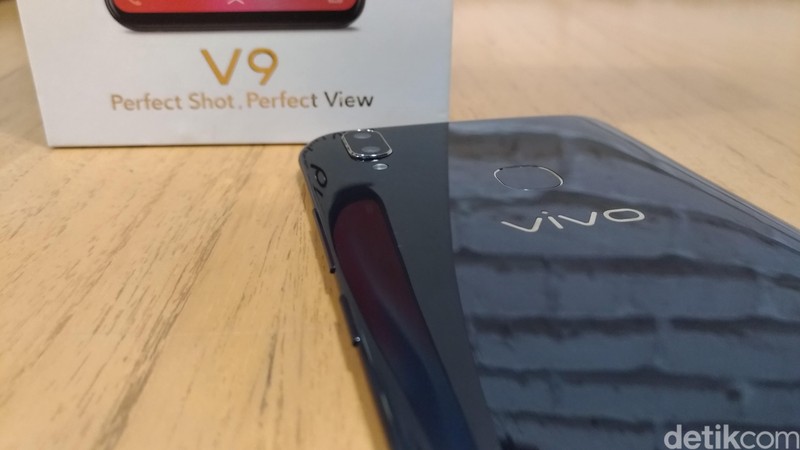 Kemudian kamera utamanya mengandalkan konfigurasi ganda dengan posisi secara vertikal. Bagian belakang Vivo V9 dibuat mengkilap untuk memberikan kesan mewah namun tetap kuat. Foto: detikINET/Moch Prima Fauzi