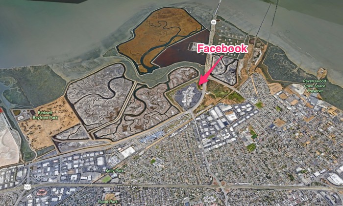 Perusahaan teknologi global banyak bermukim di San Francisco, salah satunya Facebook yang beralamatkan di Menlo Park.Β Foto: Google Earth via Business Insider