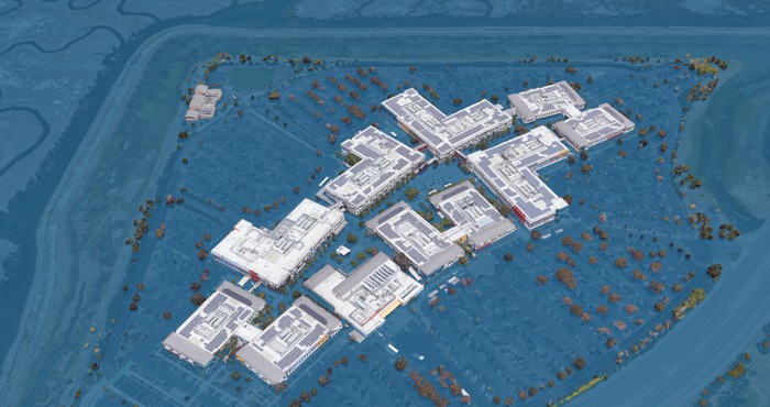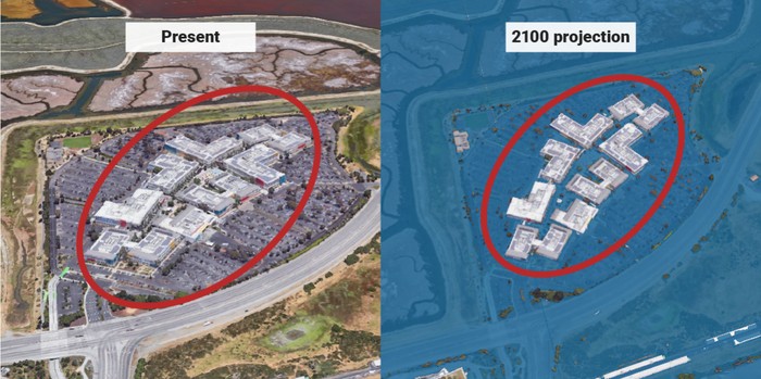 Beginilah penampakan markas media sosial terbesar di dunia itu bila air laut meluap ke daratan. Foto: Google Earth via Business Insider
