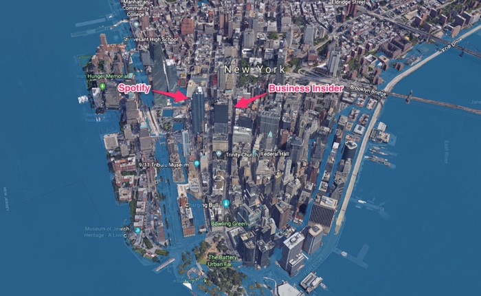 Di New York, salah satunya berdiri kantor Spotify. Foto: Google Earth via Business Insider