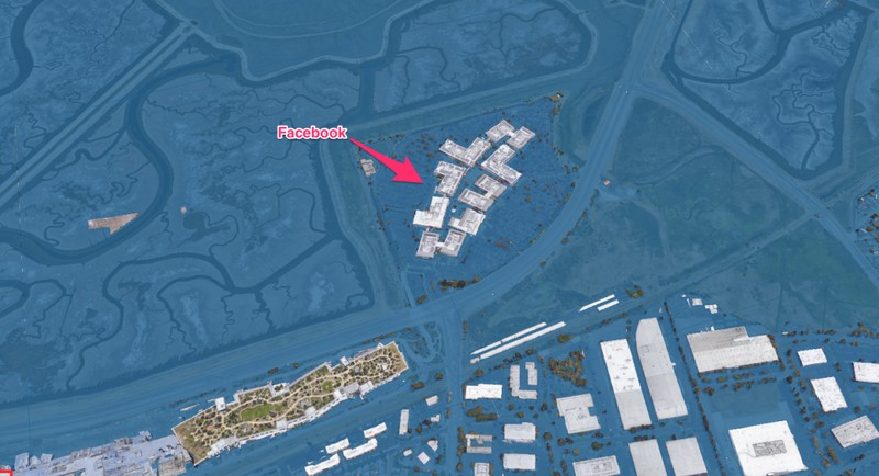 Beginilah penampakan markas media sosial terbesar di dunia itu bila air laut meluap ke daratan. Foto: Google Earth via Business Insider