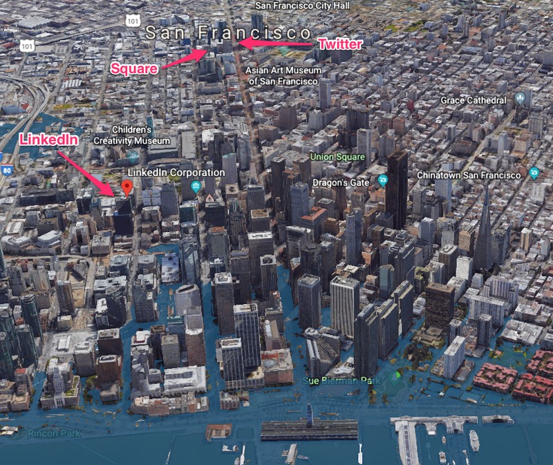 Kantor LinkedIn nyaris tenggelam, sedangkan Square dan Twitter aman dari banjir. Foto: Google Earth via Business Insider
