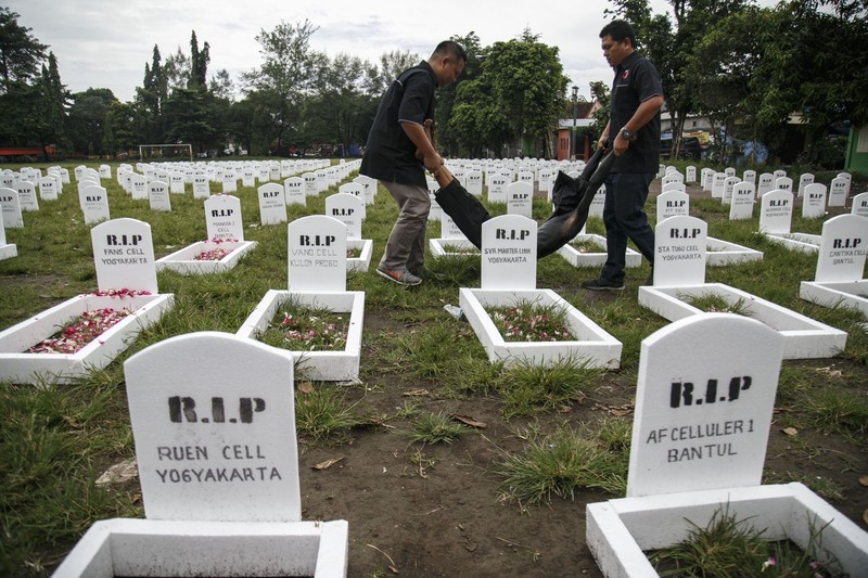 Sejumlah nisan bertuliskan nama-nama pemilik konter pulsa dipajang sebagai tanda matinya konter pulsa. Hendra Nurdiyansyah/ANTARA FOTO.