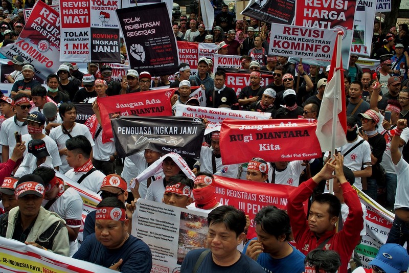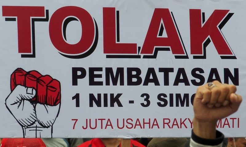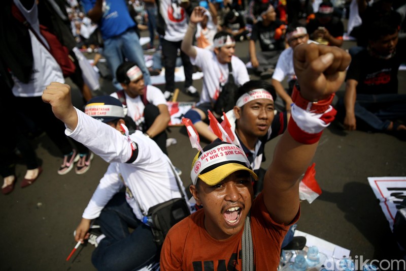 Mereka berunjuk rasa menolak pembatasan registrasi kartu prabayar telepon seluler satu NIK untuk tiga kartu. R. Rekotomo/ANTARA FOTO.